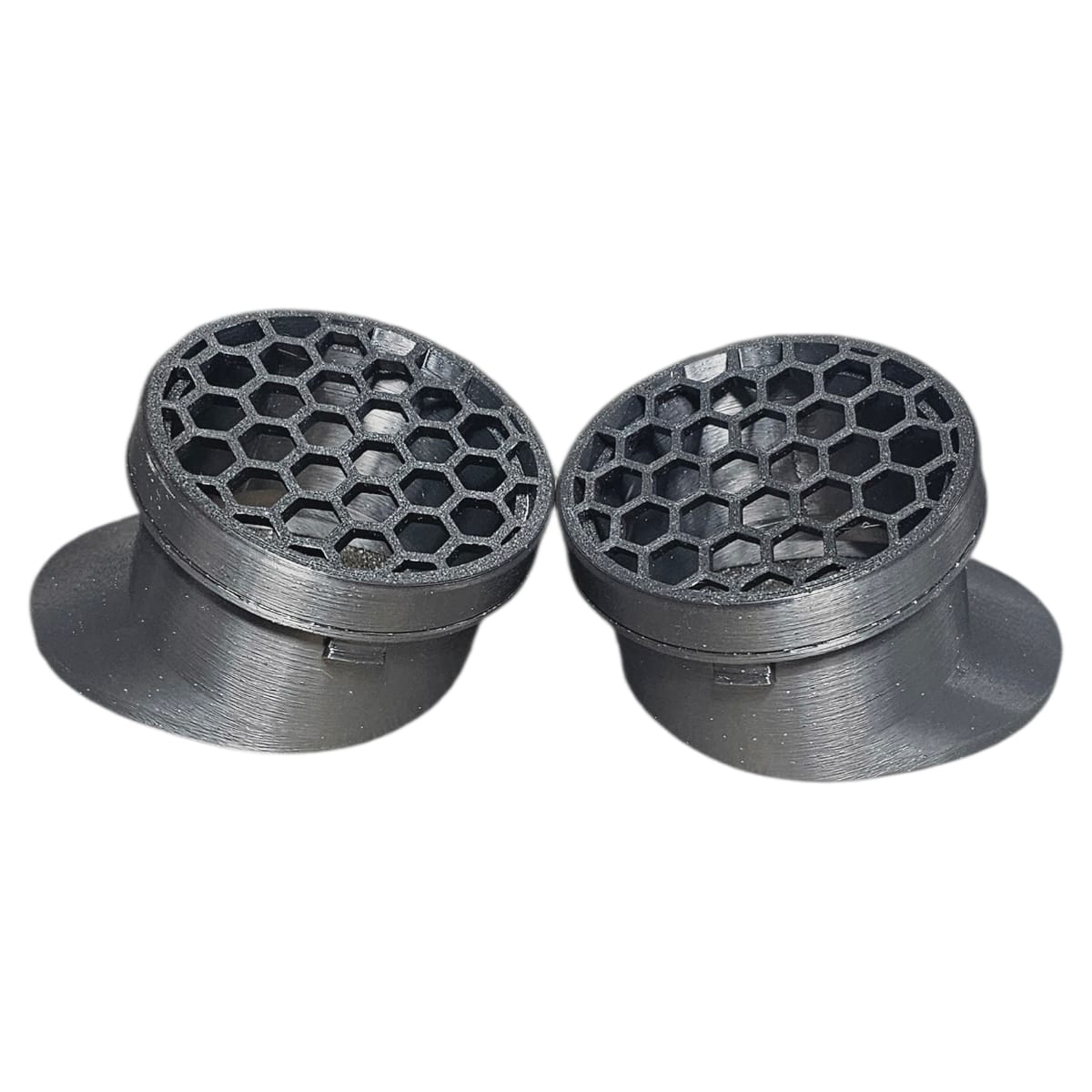 Conjunto com dois difusores de ar modelo colmeia, desenvolvido para reposição ou personalização do painel do Fiat 147 e seus derivados. Produzidos em ABS de alta resistência através de impressão 3D, oferecem boa durabilidade e encaixe adequado, mantendo a funcionalidade do sistema de ventilação interna.